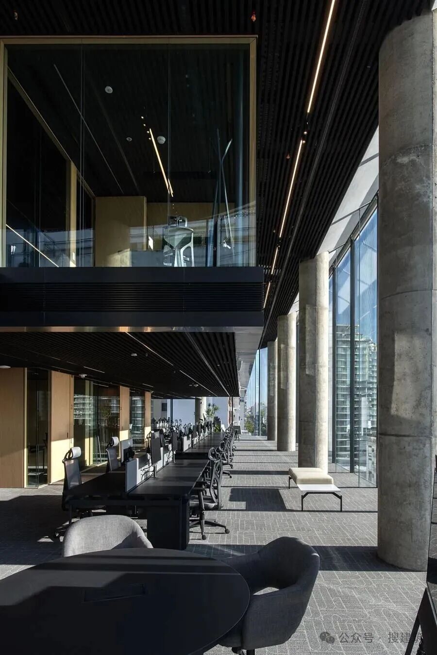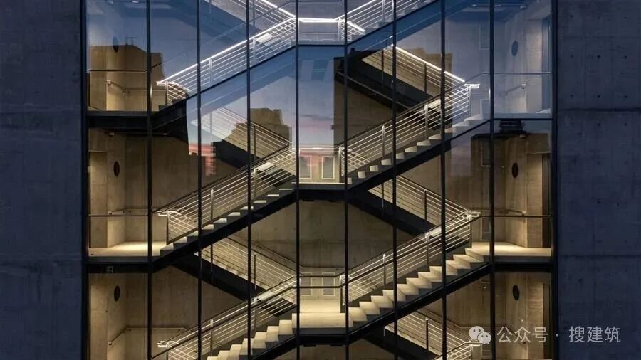 该建筑的混合结构包括一个传统的混凝土建筑(核心、柱和板)和一个两层的模块,创造了间隙层。一个雕塑般的、透明的剪刀楼梯解放了核心,鼓励连接和互动。带有悬浮夹层的双高系统创造了中间层次,最大限度地提高了可用面积,并产生了灵活和空间变化的楼板。