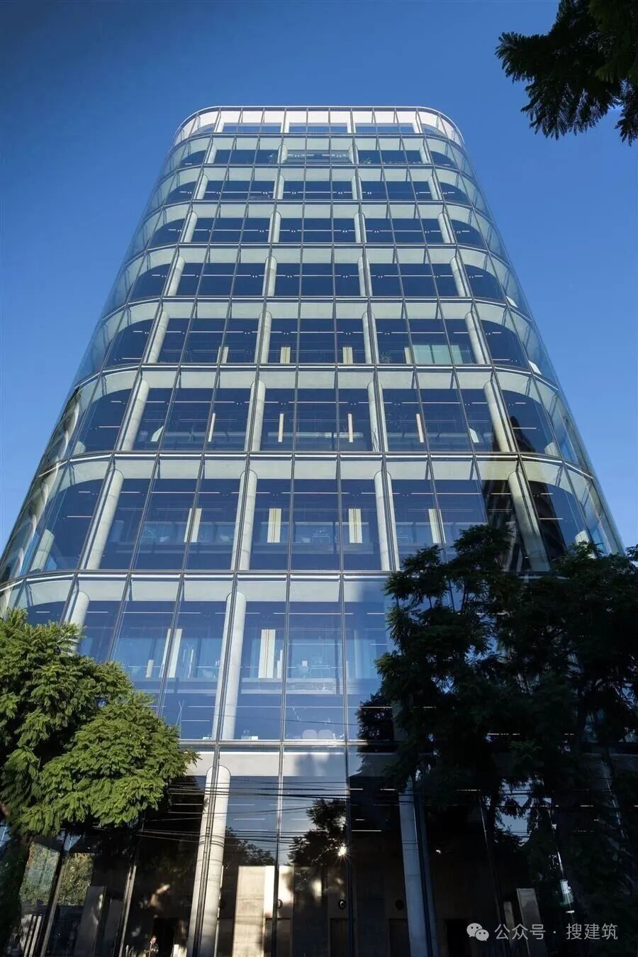 该项目由四个全玻璃立面组成,通过弯曲的玻璃角表达了精确和轻盈,没有可见的竖框,溶解了内部/外部边界,从地面无缝地上升到天空。超大的玻璃面板连续延伸到60米高的塔上。