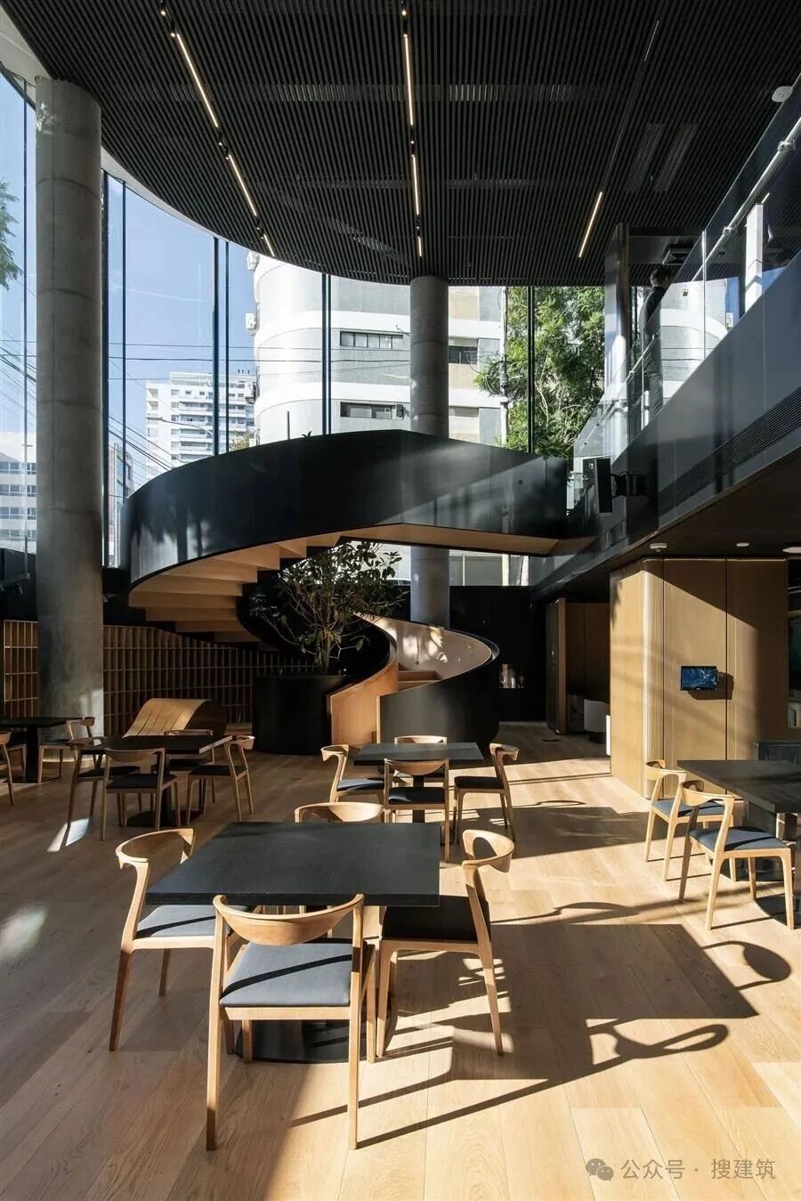 在街道层面,塔楼与城市紧密相连,其三层高的基地被设想为城市温室,设计用于容纳餐厅和其他公共用途。一个宽阔的悬臂式螺旋楼梯从街道入口下降到较低的公共层,在城市和建筑内部之间建立了强大的视觉和空间联系。员工设施包括一个屋顶露台与城市和河景,自行车架,更衣室,和淋浴。