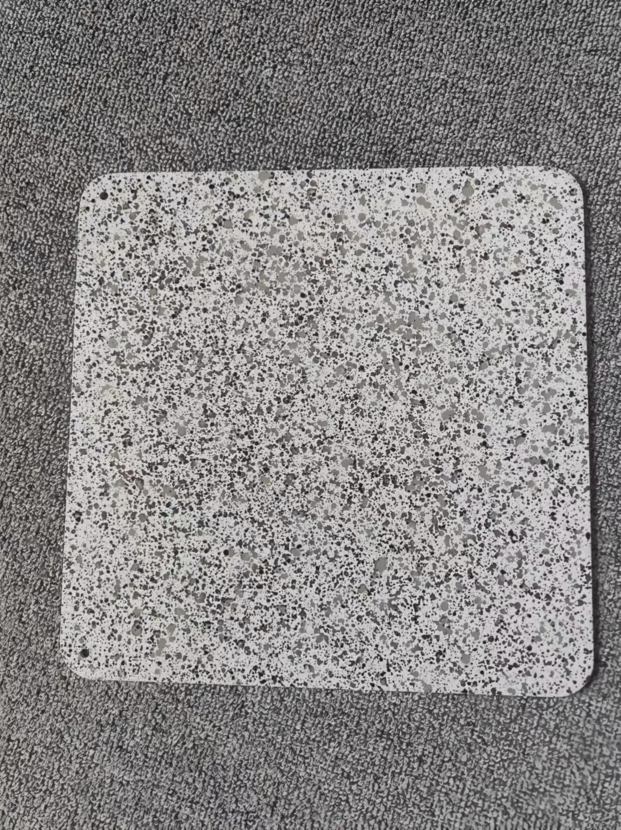 把底漆、面漆、彩点(构成石材纹理的彩色小颗粒)依次喷涂在打磨后的铝板上,然后喷罩光清漆,作用是保护+光泽感,再高温烘烤固色。