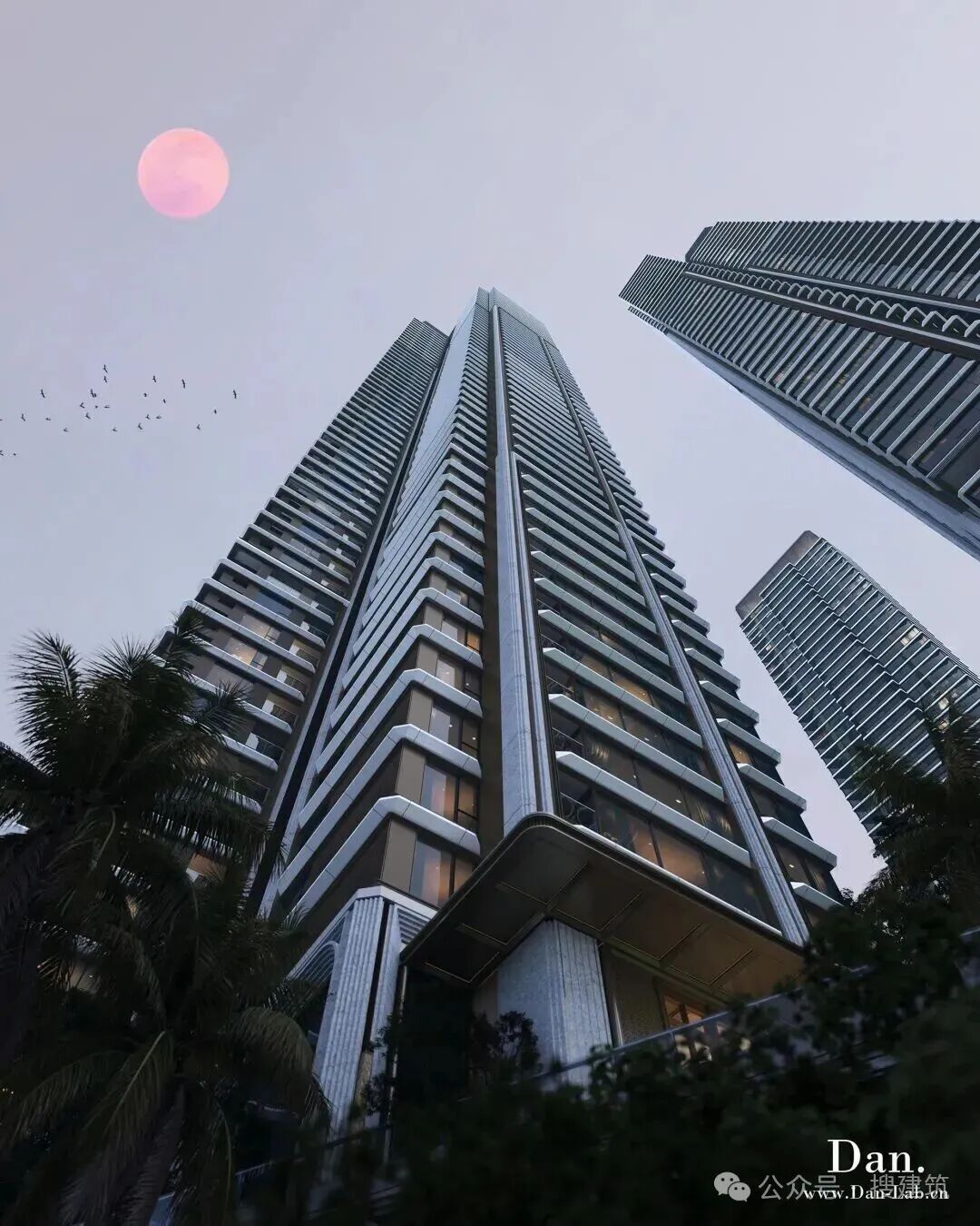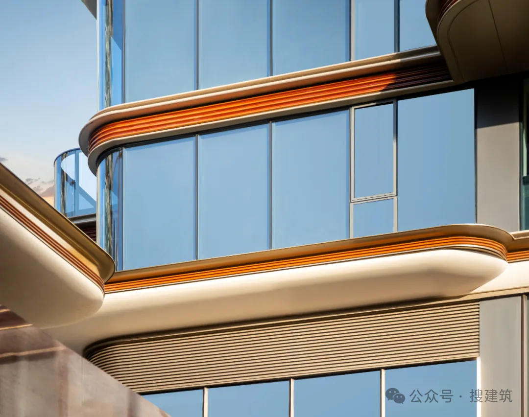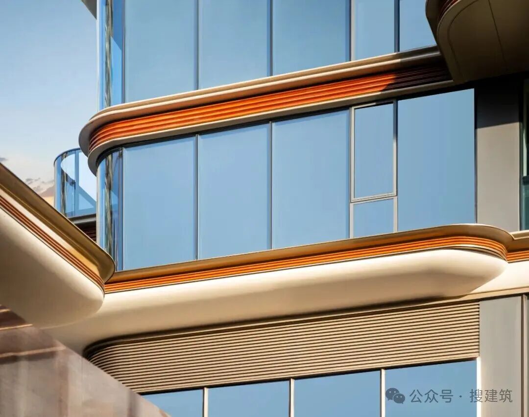 如今高端项目对玻璃提出了“四重标准”:超低能耗(如三银Low-E)、超高安全(夹胶中空)、极致通透(超白玻)以及艺术定制(彩釉、丝印)。在多材质融合中,玻璃是“留白”的艺术,它让建筑轻盈呼吸,同时将天空、云彩与周边环境纳入立面构图,成为动态的背景画布。