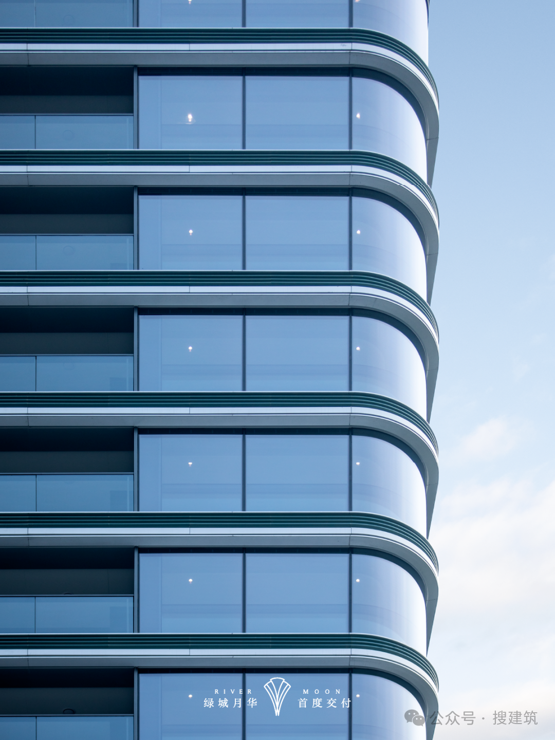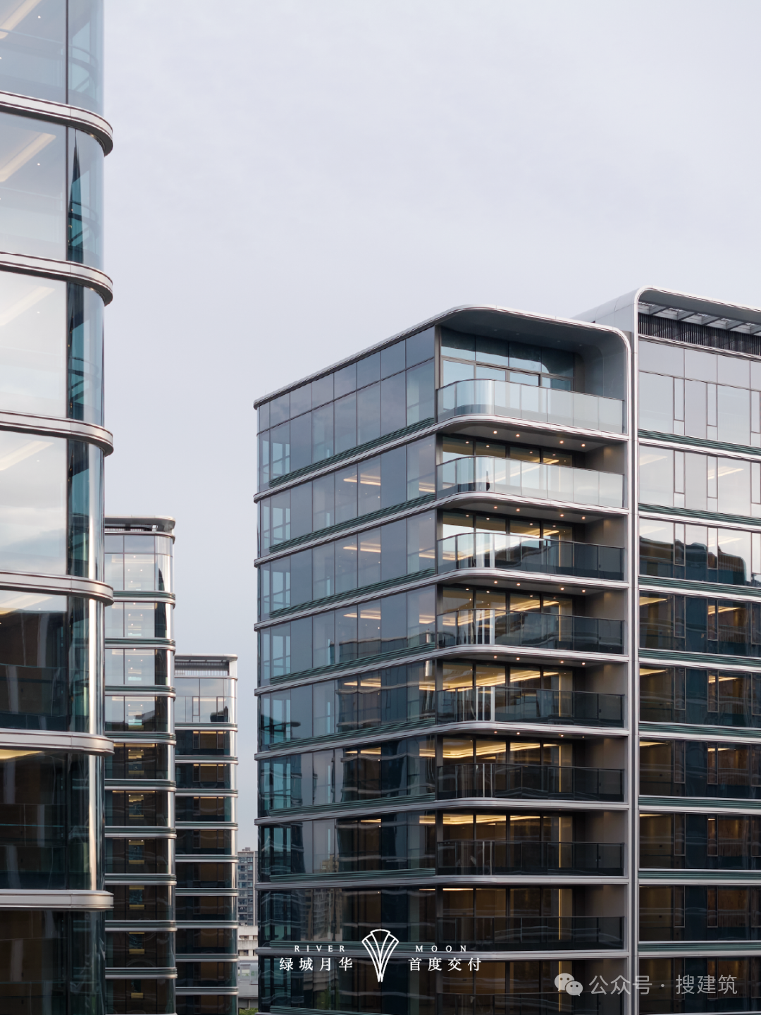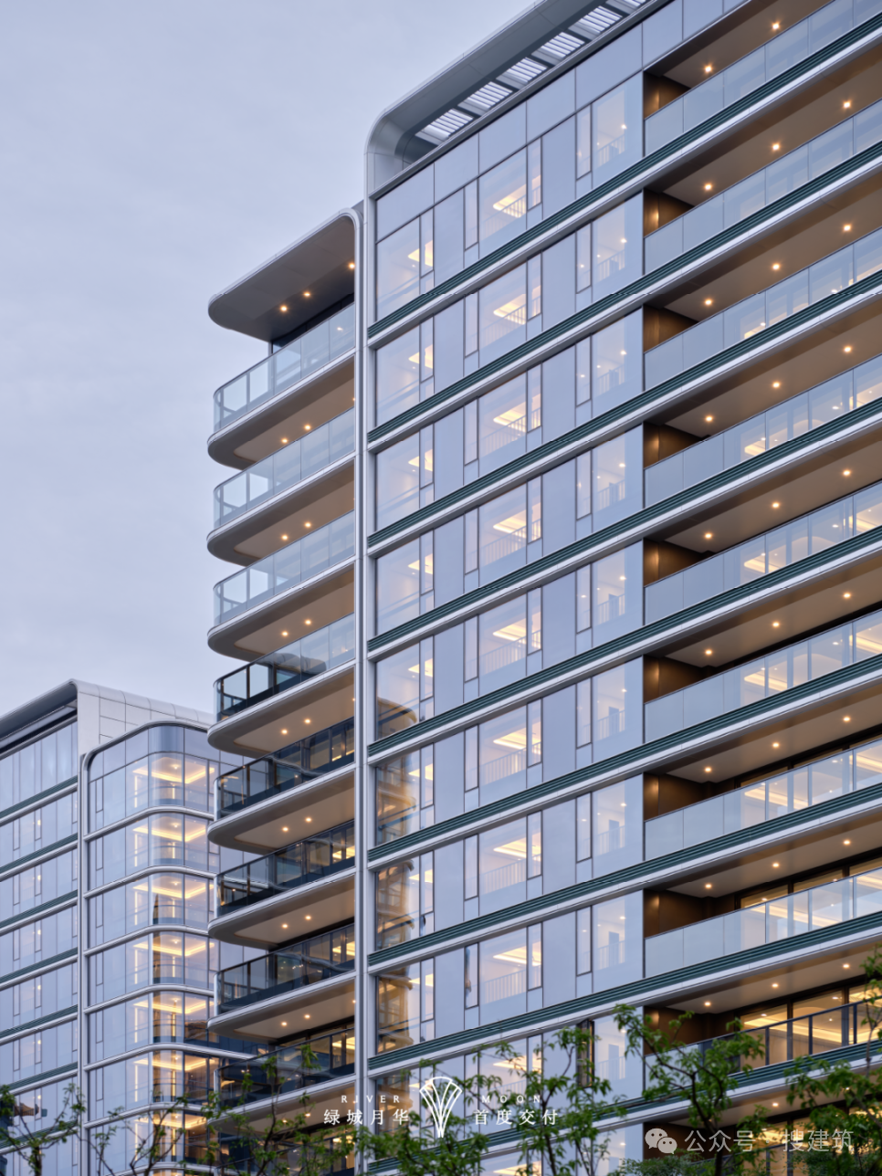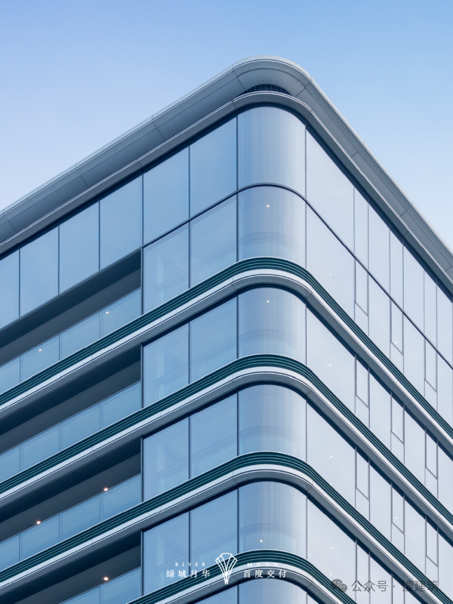 正如杭州“芝澜月华”项目所展示的,在大面积玻璃幕墙的通透基底上,巧妙嵌入铝板线条与深绿色陶板,不仅打破了立面的单调,更通过材质的对比营造出丰富的视觉节奏与色彩变化,让建筑在阳光下呈现出动态的艺术效果: