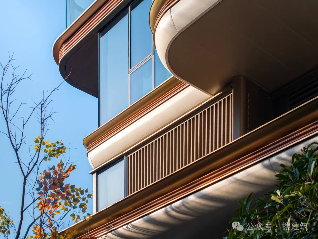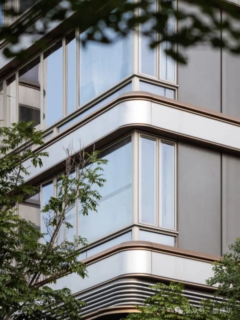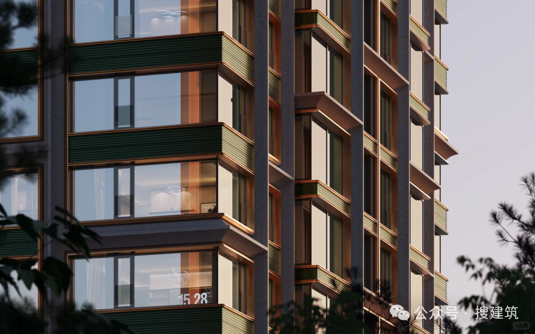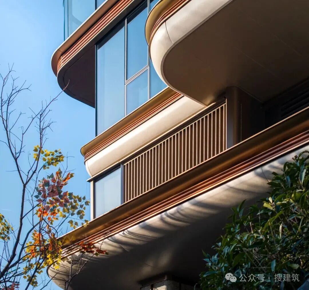 正如杭州“芝澜月华”项目所展示的,在大面积玻璃幕墙的通透基底上,巧妙嵌入铝板线条与深绿色陶板,不仅打破了立面的单调,更通过材质的对比营造出丰富的视觉节奏与色彩变化,让建筑在阳光下呈现出动态的艺术效果: