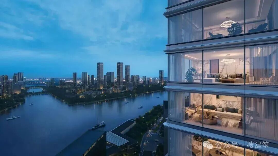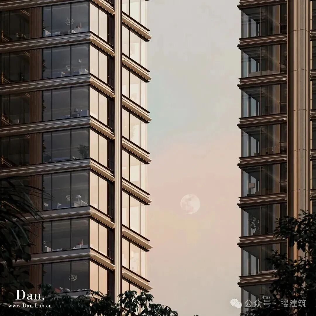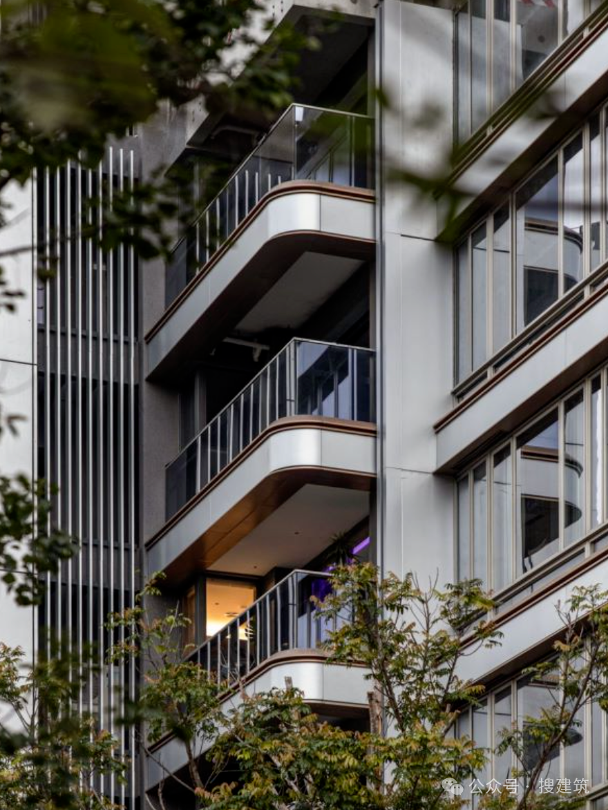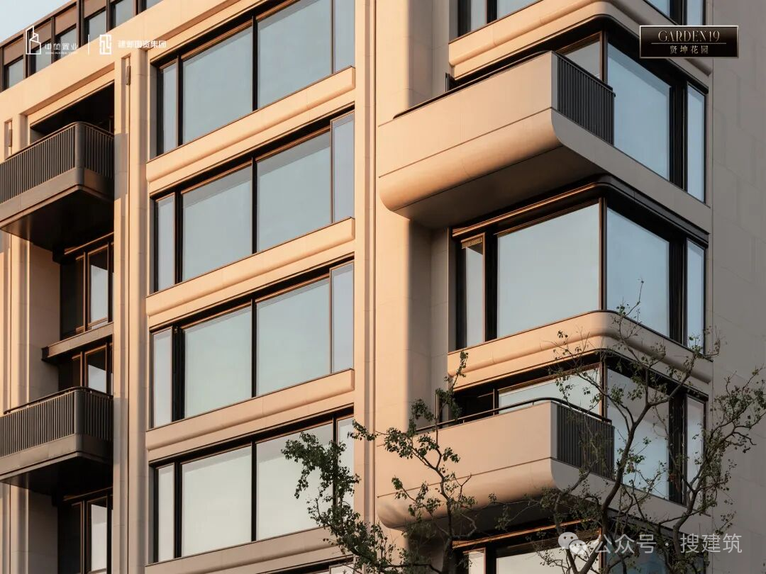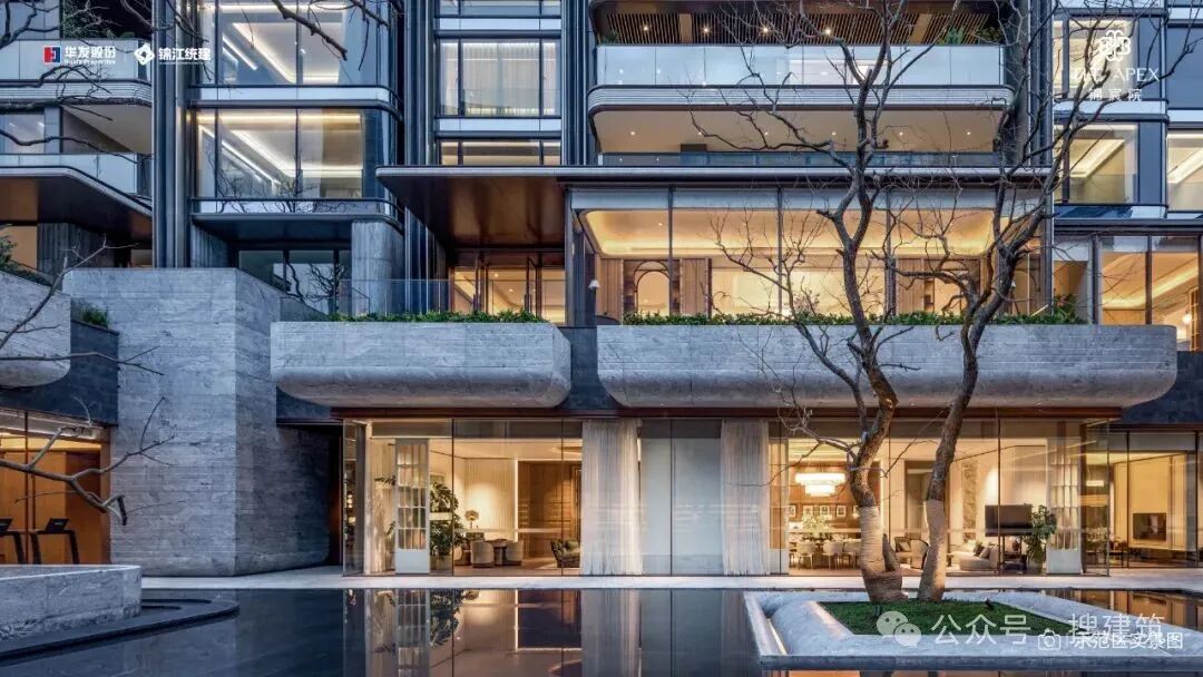正如杭州“芝澜月华”项目所展示的,在大面积玻璃幕墙的通透基底上,巧妙嵌入铝板线条与深绿色陶板,不仅打破了立面的单调,更通过材质的对比营造出丰富的视觉节奏与色彩变化,让建筑在阳光下呈现出动态的艺术效果: