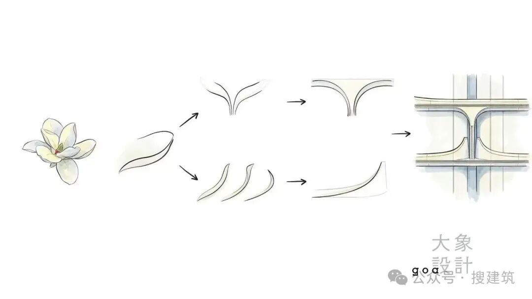 设计以上海市花白玉兰为意象原型,通过曲面弧线穿插、15° 建筑扭转与体块切分,将层叠花瓣抽象为独特双曲面花瓣表皮,既是对解构主义建筑 “动态形态” 的本土化创新,更精准解决了自由形态与住宅功能的融合难题 —— 起翘弧线与剪力墙对应,在塑造张扬视觉形象的同时,最大限度减少对室内空间的干扰,实现实用性与艺术表现力的平衡。