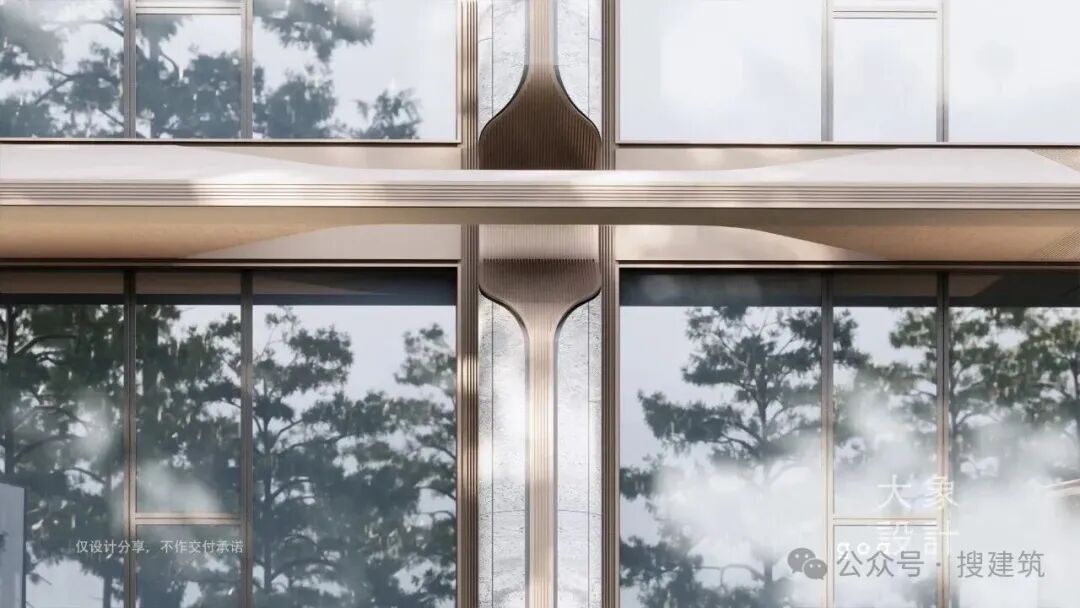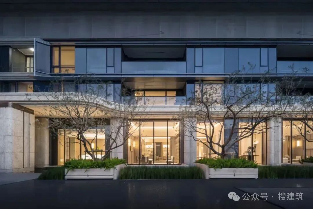 立面弧形的石材卷轴,向天空挺拔,隆起建筑的风骨,装帧天空的东方气韵;温润石材,历经千万年淬炼的白世茂花岗石,米黄色的温润色调,让时间洗练建筑的优雅;窗格家徽,镌刻家族徽章的“十”字造型金属窗框,给建筑系上缎带,寄给未来的家族礼物。